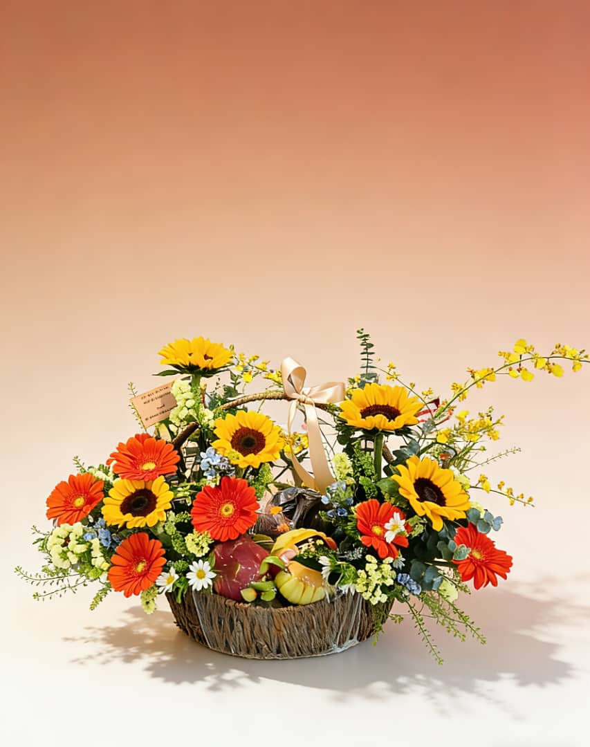 Celebrate the beauty of autumn with this stunning Autumn Harvest Flower Basket. Overflowing with vibrant colors and textures, this arrangement captures the essence of the season. The basket features a mix of sunflowers, gerbera daisies in shades of orange and red, and delicate yellow blossoms, creating a warm and inviting display. Accented with lush greenery and a decorative ribbon, this basket is a perfect centerpiece for your fall decor or a thoughtful gift for any occasion.