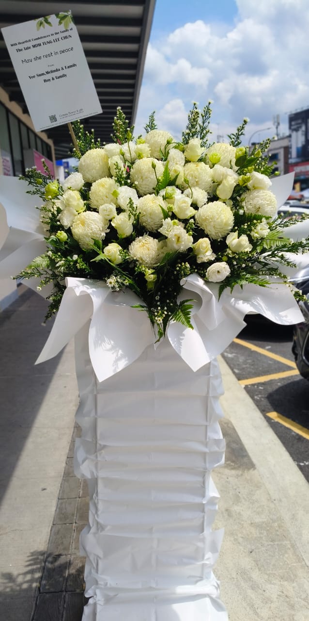 Express your deepest condolences with this elegant white funeral flower stand. This arrangement is a beautiful and respectful tribute, perfect for honoring the memory of a loved one. The stand features a lush arrangement of white chrysanthemums, roses, and other delicate white flowers, accented with verdant greenery. The flowers are carefully arranged to create a serene and comforting display. The arrangement is supported by a white stand, adding to the overall elegance and stability of the display. This flower stand is suitable for funeral homes, memorial services, and graveside ceremonies. Key features and benefits: * Classic and elegant white floral arrangement * Features a mix of chrysanthemums, roses, and other white flowers * Accented with lush greenery * Provides a respectful and comforting tribute * Suitable for funeral homes, memorial services, and graveside ceremonies * Sturdy white stand for stability and display * Expresses sympathy and support to the bereaved * Creates a serene and peaceful atmosphere This funeral flower stand is a thoughtful way to show your support and sympathy to the family and friends of the deceased. It is a beautiful and meaningful gesture that will be appreciated during a difficult time. The all-white arrangement symbolizes peace, reverence, and remembrance, making it a fitting tribute to honor the life of the departed.
