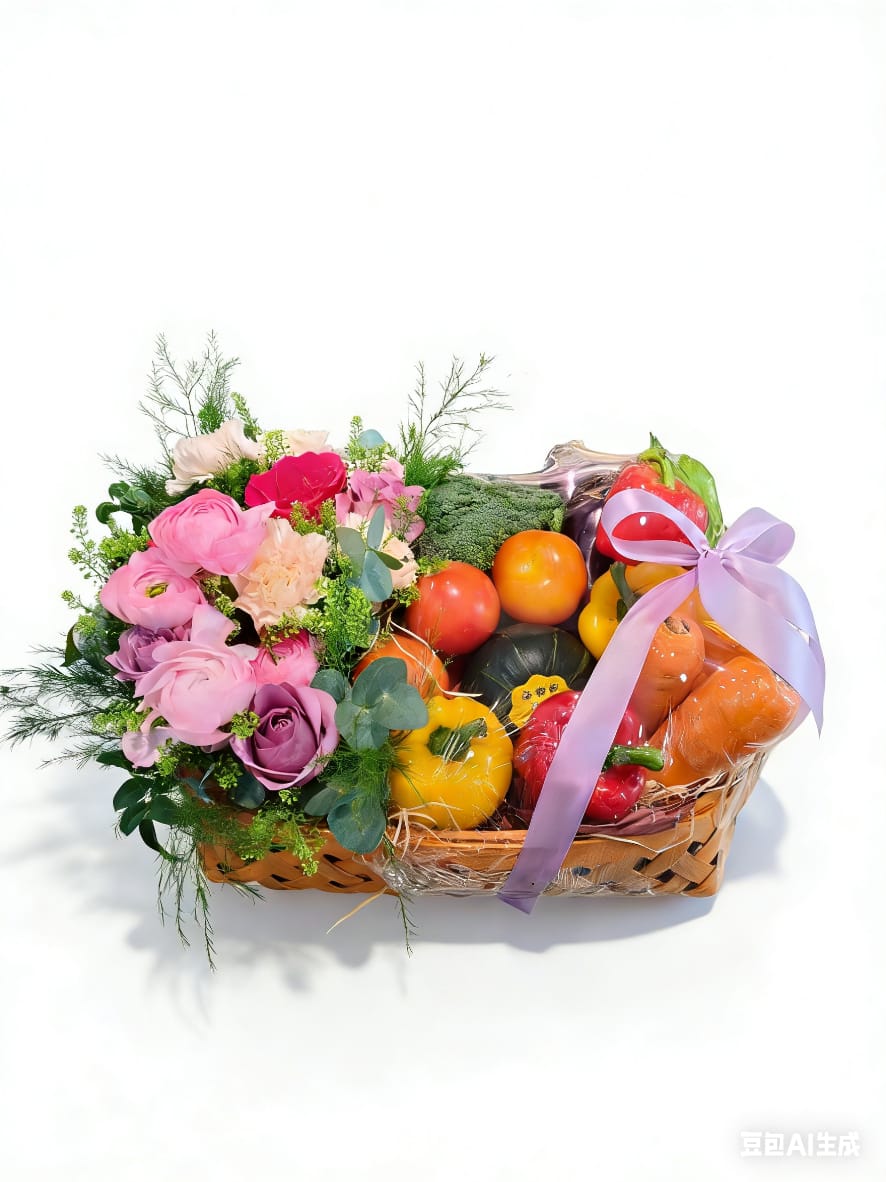Give the gift of freshness and beauty with this exquisite floral and vegetable gift basket. It's a perfect way to show someone you care, whether it's for a birthday, anniversary, or just because.