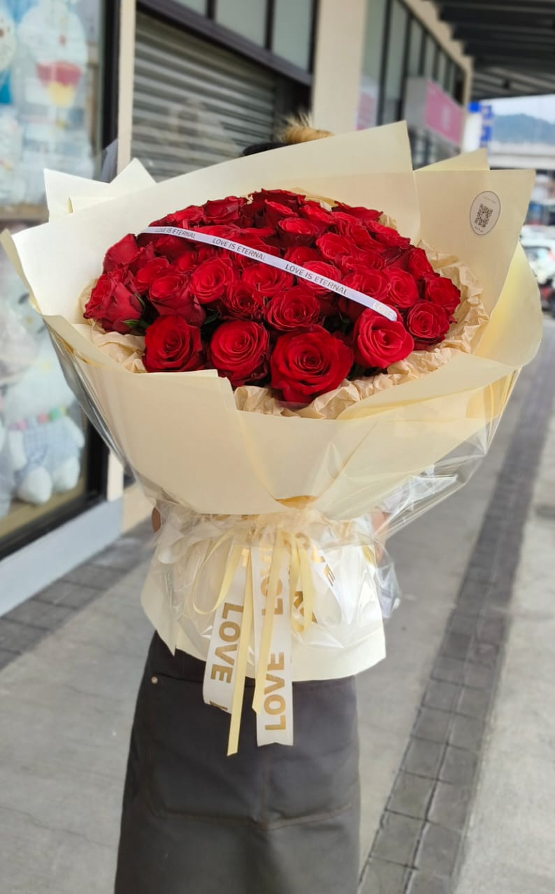 Express your deepest emotions with this stunning bouquet of vibrant red roses. Expertly arranged and carefully wrapped, this bouquet is the perfect way to convey love, passion, and admiration. Whether it's for a special occasion or just because, this timeless gift is sure to make a lasting impression. This luxurious bouquet features dozens of fresh, high-quality red roses, hand-selected for their beauty and fragrance. The roses are artfully arranged in a classic dome shape, creating a visually striking display. A decorative ribbon with the words "LOVE IS ETERNAL" gracefully encircles the roses, adding a touch of elegance and sentimentality. The bouquet is then wrapped in layers of soft, cream-colored paper and clear cellophane, providing protection while enhancing its visual appeal. The base of the bouquet is tied with matching cream-colored ribbons, completing the sophisticated look. This bouquet is ideal for a variety of occasions, including anniversaries, Valentine's Day, birthdays, or as a heartfelt gesture of love and appreciation. It's a perfect gift for romantic partners, family members, or anyone you want to show you care. Key Features and Benefits: * Dozens of fresh, vibrant red roses * Expertly arranged in a classic dome shape * Elegant ribbon with "LOVE IS ETERNAL" message * Wrapped in protective and visually appealing paper and cellophane * Tied with matching cream-colored ribbons * Perfect for expressing love, passion, and admiration * Ideal for anniversaries, Valentine's Day, birthdays, and other special occasions * A timeless and unforgettable gift Surprise your loved one with this exquisite red rose bouquet and create a moment they will cherish forever.