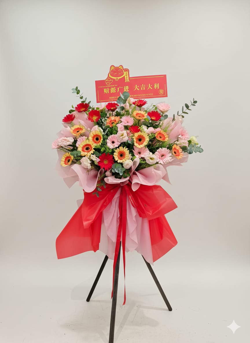 Grand Opening Flower Stand with Gerbera Daisies and Lucky Cat Sign